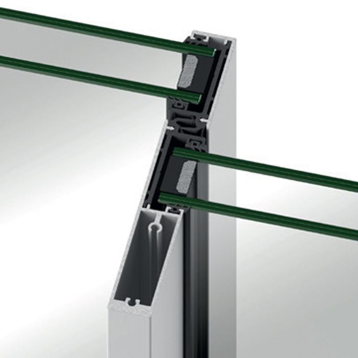 Hojas de corte recto de 42 y 46 mm de profundidad y sección vista de 70 mm para la versión de apertura deslizante y 80 mm para la versión de apertura elevable, con posibilidad de espesor de acristalamiento de hasta 32 mm.