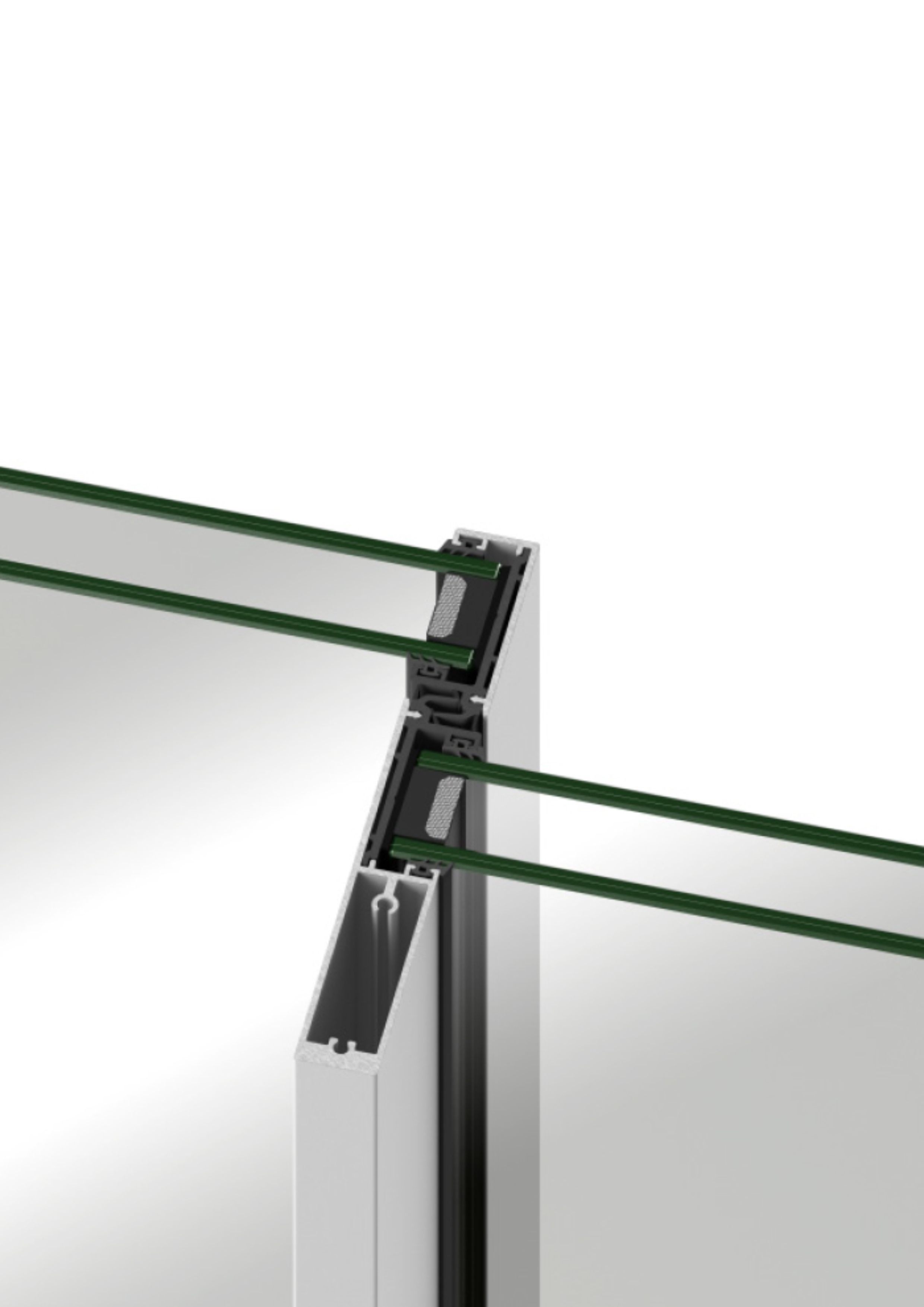 Vantaux à coupe droite d'une profondeur de 42 et 46 mm et d'une section visible de 70 mm pour la version ouvrant coulissant et de 80 mm pour la version ouvrant levant, avec possibilité d'une épaisseur de vitrage jusqu'à 32 mm.